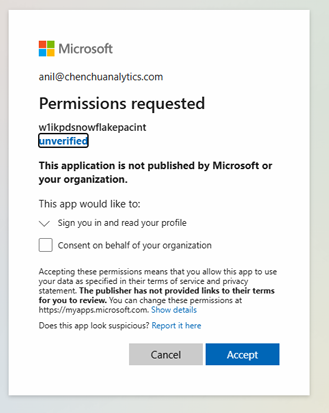 - A Microsoft permissions page will appear. Approve the request to allow Snowflake to integrate with your ADLS environment.