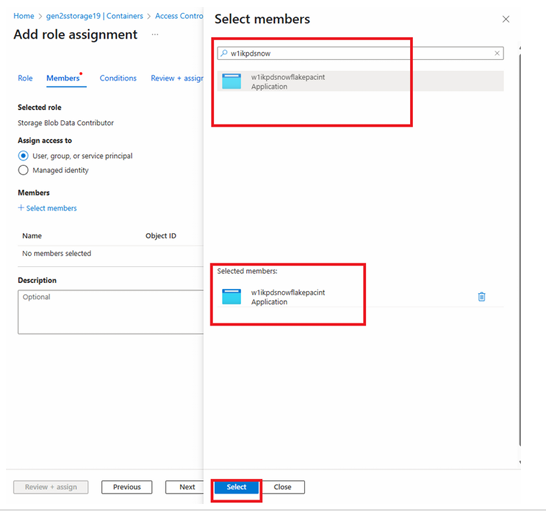 Member selection panel showing the Snowflake application/service principal found through search and selected for role assignment.