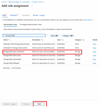 IAM panel showing the Add Role Assignment dialog and the Storage Blob Data Contributor role highlighted.