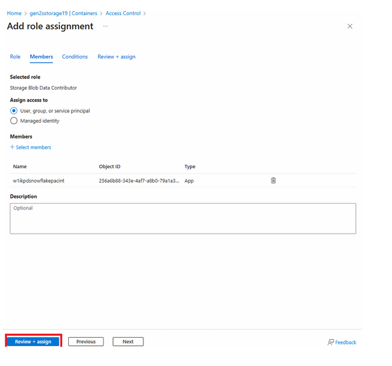 - Azure will apply the Storage Blob Data Contributor role to the Snowflake service principal