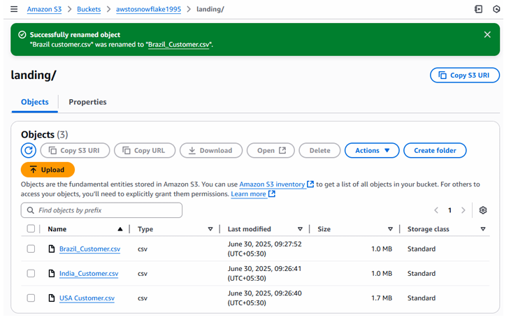 Fig: AWS S3 bucket and landing folder view