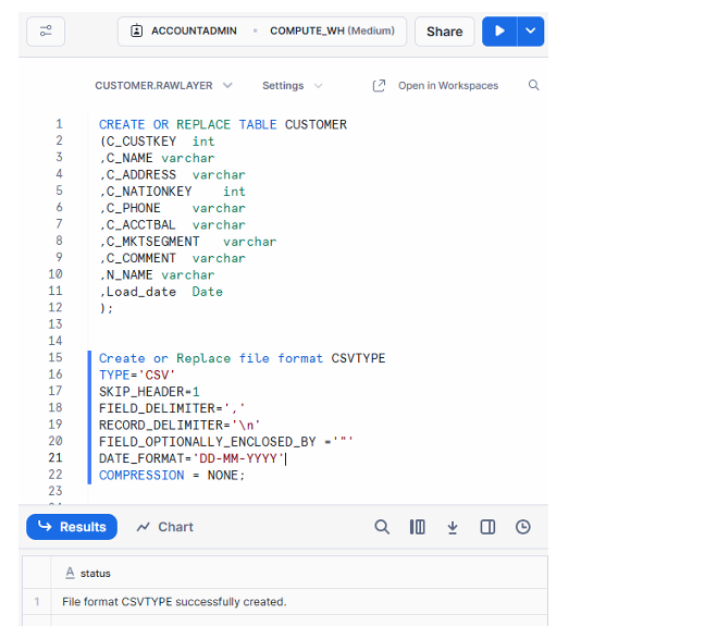 Fig : Snowflake worksheet with table & file format