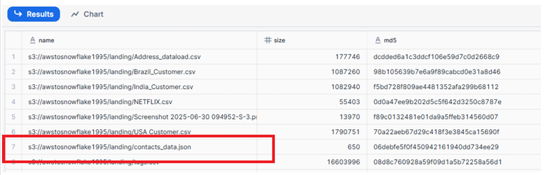 contacts_data.jsonfrom S3 into the raw table. - Specifies the external stage as the source.