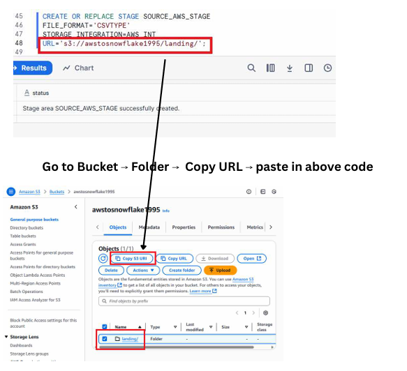 This stage acts as a pointer that lets Snowflake access the files inside the landing folder of your S3 bucket.