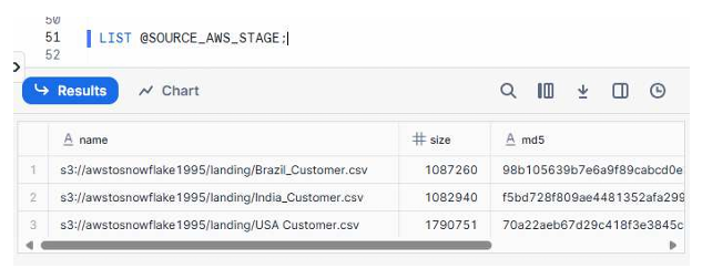 This confirms whether Snowflake can access your S3 bucket and shows all available files.