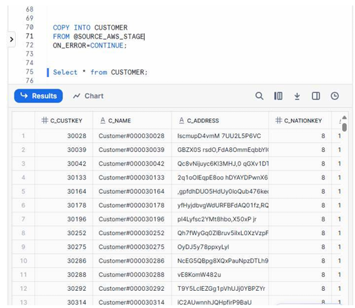 COPY INTOcommand loads all matching files from the stage. ON_ERROR = CONTINUEensures minor row-level errors don’t interrupt the full load.- After execution, you can query the CUSTOMER table to validate data.