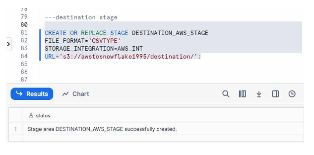 This stage targets the destination/ folder created in S3 and allows Snowflake to write files into it.