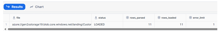 Output showing file names inside ADLS with status LOADED, indicating Snowflake was able to retrieve metadata from the stage.