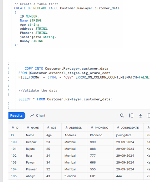 Rows of ID, Name, Address, PhoneNo, Joiningdate, and Runby displayed in Snowflake query results, confirming successful ingestion using COPY INTO.