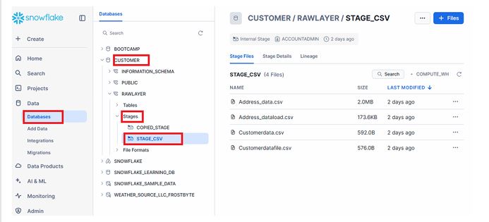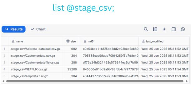 This helps confirm your uploads and ensures that Snowflake recognizes the files before initiating data load operations.