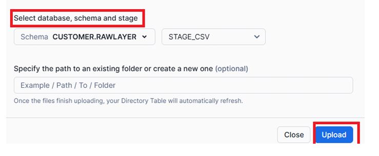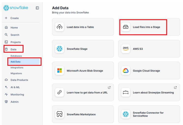 Snowflake provides an easy-to-use graphical interface for uploading files directly into internal stages — ideal for quick testing or small data uploads.