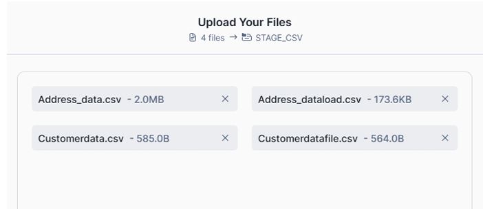 Once uploaded, the files become immediately available for loading into Snowflake tables using COPY INTO commands.
