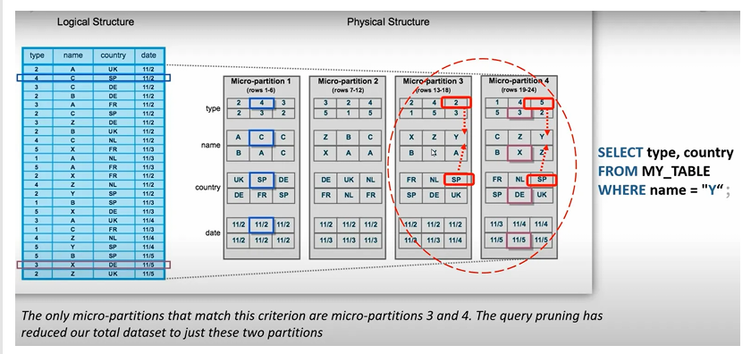 Snowflake evaluates micro-partition metadata, not the full data, to decide which partitions might contain rows where name = 'Y'.