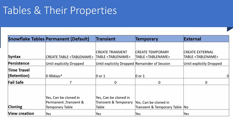 The table compares the four major table categories and clarifies how each behaves across six key dimensions: Syntax, Persistence, Time Travel, Fail-Safe, Cloning, and View creation. The text below recreates and expands on the concepts.