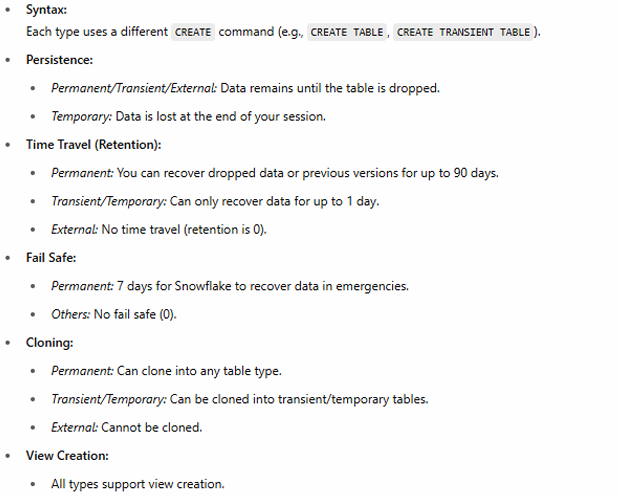 Understanding syntax is important because Snowflake does not allow converting a table type later (e.g., temporary → permanent).
