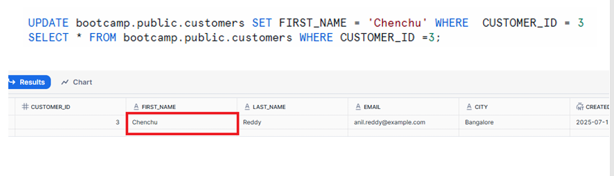 The row for CUSTOMER_ID = 3 now shows FIRST_NAME = ‘Chenchu’.