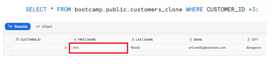 The clone still shows FIRST_NAME = ‘Anil’, confirming independence.