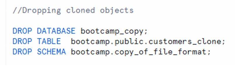 - Instant duplication of databases, schemas, tables, streams, stages, file formats, tasks